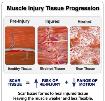 When there is an area of disuse, overuse or injury - the collagen in fascia becomes thicker in that area and there is less nutrient transfer and less ability to flush toxins. As this thicker fascia becomes less mobile, injury and postural dysfunctions occur. Muscles, ligaments, and tendons have less nutrient transfer, less waste disposal, less water content and become stiffer and fibrotic. Tissue in the deep and visceral layers can form connective tissue adhesions causing pain and “trigger points” (Myers 2001). A release of these adhesions via a variety of mechanical stimulation (cupping, massage, acupressure, acupuncture with needles, stretching, ultrasound, shockwave, electrical muscle stimulation) allows the cells to spring back into shape and function. For example, a needle inserted into these collagen fibres causes a “mechanotransduction” stimulating receptors and thus affecting circulation, reducing pain and promoting healing.